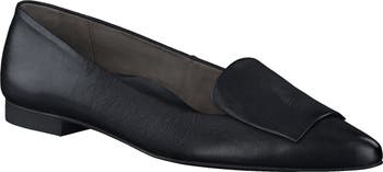 A geometric overlay enriches the instep of a rich leather flat fashioned with a pointy toe for contemporary appeal.