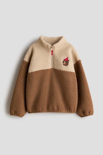 Top in soft teddy with a small appliqué on the front. Stand collar, zip at the top, dropped shoulders and jersey binding at the cuffs and hem.
