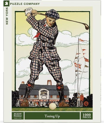 Step back in time with Teeing Up, a 500-piece puzzle from our Vintage Images collection, featuring the classic artwork of Edward Penfield—one of America’s foremost illustrators. This elegant scene captures a turn-of-the-century golfer mid-swing, dressed in a plaid suit, shirt and tie, argyle knee socks, and brown brogue golf shoes. In the distance, a crowd looks on from the clubhouse, evoking the early days of the sport. A perfect puzzle for golf lovers, history enthusiasts, and fans of vintage Americana, Teeing Up offers timeless charm and a satisfying challenge.