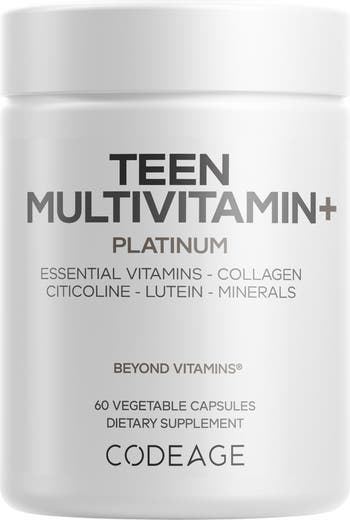 - Codeage Teen Multivitamin+ Platinum features a broad spectrum of vitamins A, C, D3, E, K2, B6, B12, folate, and biotin. This teenager vitamins supplement also includes minerals such as zinc, iron, magnesium, selenium, and calcium from Aquamin®, supporting a comprehensive micronutrient profile.