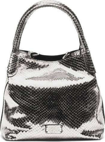 Fun and festive, this snakeskin-embossed metallic leather handbag keeps your essentials stylishly in check—while interior grommets transform the shape from a compact tote to a bucket bag.