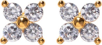 Cubic zirconia clusters sparkle on teeny tine stud earrings in high-shine 18-karat gold plate.