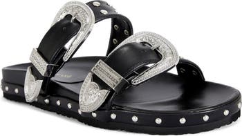 Polished studs and buckle hardware dial up the utilitarian style of this two-strap sandal.