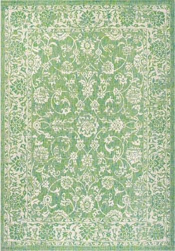 With a vine-and-border design inspired by Persian rugs, our Boho-chic rug adds eclectic style to an outdoor porch or patio. Varied tones of soft green mingled with a cream pattern give this rug a hand-woven, vintage vibe. The flatweave design is great for high-traffic spaces indoors too.