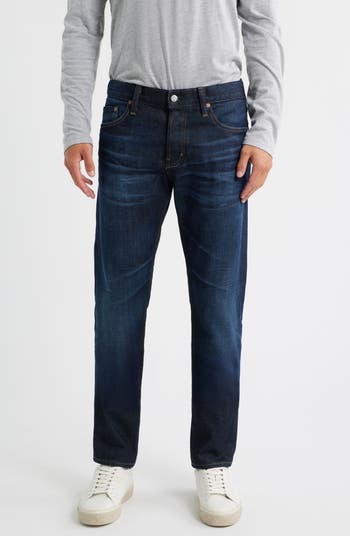 Slim-fitting jeans in a faded dark wash are made from premium Japanese stretch denim that retains its shape from day to night.