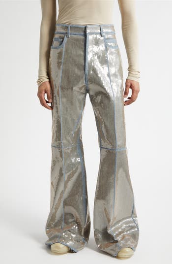 The label's signature 'glunge' (glamour meets grunge) aesthetic infuses these pooling bootcut jeans with futuristic rocker vibes. Hints of light-blue denim create clean lines through the blanket of shimmering sequins.