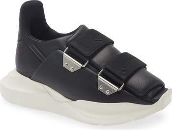 Created from tumbled calfskin leather, this futuristic sneaker features two herringbone straps that are secured by industrial-looking D-rings held by riveted plates. It's set on a thick, geometric sole with an extended heel and square toe.