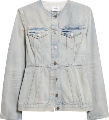 A sculpted waist and a collarless neckline reimagine the classic trucker silhouette of this nonstretch-denim jacket from the Japanese-influenced Italian label.