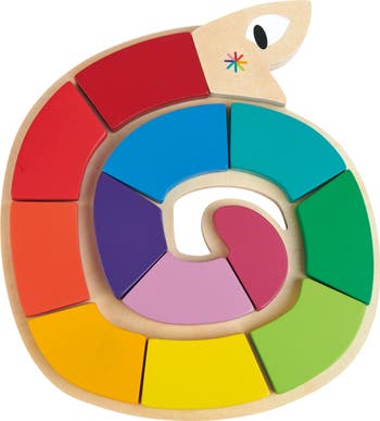 Learn colors and shapes in style with a brightly colored snake whose pieces match up with a 3d shape underneath to reveal the color spectrum.