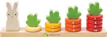 Help rabbit count carrots in this stacking toy that teaches children how to count from 1 to 10 while learning color-sorting and hand-eye coordination.