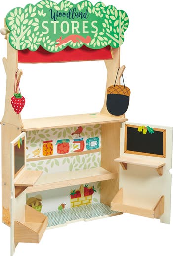Featuring fun on both sides, this cool set lets your little one have fun at the theatre or at the local shops. The theatre features a red curtain, two darling puppets and an acorn-shaped blackboard to mark showtime. The shops side features usable shelves, a sizable blackboard and a curtain that anounces when the store is closed.