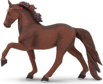 Famed for their smooth running walk, the Tennessee Walking Horse offers a ride that's easy on both rider and horse. This breed's unique gait, an inherited trait, ensures a comfortable, smooth ride. The Safari Ltd. Tennessee Walking Horse figurine captures the essence of this breed in the midst of its most recognizable movement. Hand-painted with lifelike detail, the model showcases decorative bands and flowers in the horse's mane, indicating its show horse status. Made from high-quality, non-toxic, BPA-free PVC, this figurine is a fun play companion that also serves as an educational tool. It sparks curiosity about different horse breeds and their unique characteristics. Measuring 5.25 inches long and 4.25 inches tall, this chestnut-colored Tennessee Walking Horse figurine is slightly smaller than a DVD case. It forms part of the Winner's Circle collection, an exciting range of horse breeds by Safari Ltd. Whether for horse enthusiasts, collectors, or children who love animals, this realistic, hand-painted Tennessee Walking Horse model makes a wonderful gift. It's sure to inspire imagination and encourage learning, making it a fantastic addition to any toy collection.