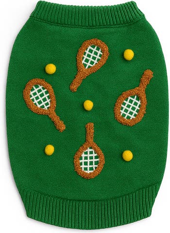 Help your preppy pet ace their style game on and off the court in this tennis-themed sweater covered in fuzzy rackets and pompoms.