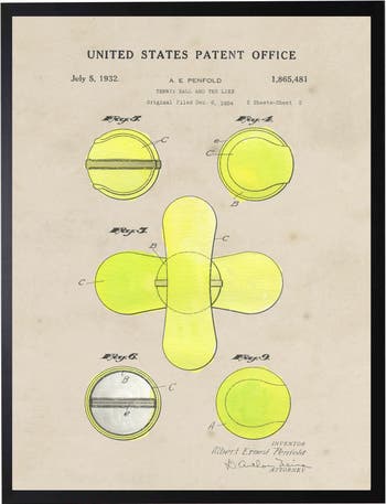 This vintage-inspired print, framed in a black wooden frame, features a tennis ball patent. Sized at 16 inches by 20 inches, this made in the USA frame makes for a beautiful addition to any wall.