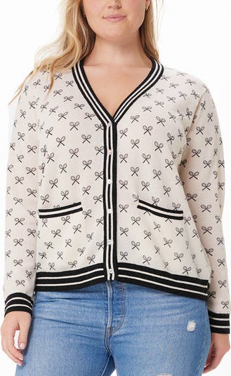 Striped trim and allover tennis rackets add major preppy vibes to this V-neck cardigan knit from luxuriously soft cashmere yarns.