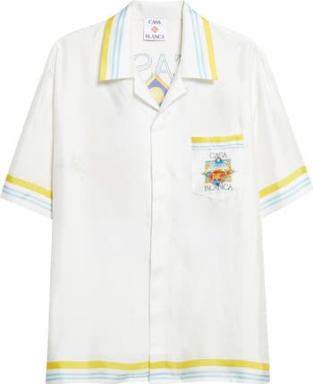 This fluid Italian-silk button-up hits a retro-eclectic groove that's crisp in white with sunny stripe trim that frames the relaxed silhouette. A vibrant tennis graphic pops at the chest pocket then goes full-court on the back, serving the label's signature sporty charge with gallery-level color.