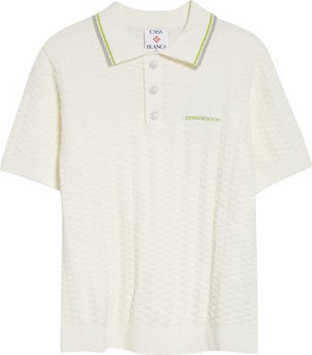 Pearly baubles at the placket playfully contrast with the sporty tipped spread collar on this logo-embroidered polo rendered in tantalizing bouclé-knit fabric.