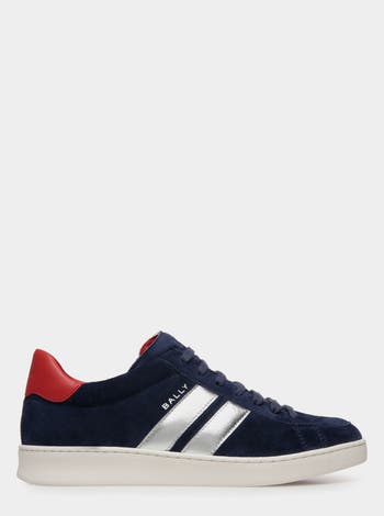 This Tennis sneaker in navy blue suede has a colorful pop of Candy Red leather on the heel counter and lining. A padded Bally Ribbon in silver leather decorates the quarter.