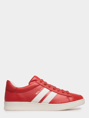 In Candy Red, this lace-up Tennis sneaker features a sleek silhouette and assured character. Leather overlays create the Bally Ribbon at the sides.