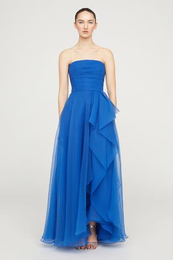 Our Teresa is sculpted in pebble organza—a weightless and high-quality fabric woven to give your style movement and bounce. This radiant piece comes strapless and features a draped bodice, front slit accent, and a cascading ruffled skirt.