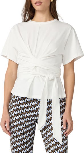 Twisted and knotted front ties refresh a traditional cotton T-shirt bringing modern edge to a classic wardrobe staple.