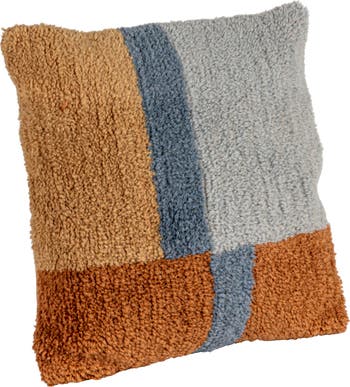 - A mosaic of earthy elegance, this pillow interlaces hues of brown, tan, grey, and blue in a tufted New Zealand wool and cotton tapestry