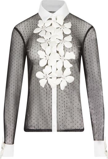 The Terra shirt is a true designer statement piece from Anne Fontaine, blending ethereal texture with sculptural artistry. Crafted in sheer net embroidered with a delicate polka dot motif, this shirt exudes modern femininity with a whisper of romance. A crisp white crepe collar and a concealed center button placket ground the design in classic tailoring, while French cuffs offer a refined finish and accommodate cufflinks for elevated styling. What truly defines this piece, however, is its stunning front embellishment—oversized 3D white floral appliqués cascade down the placket, each petal carefully molded and centered with a luminous pearl and crystal detail. These florals reappear on the cuffs, adding a balanced elegance and dramatic texture. Both artful and refined, the Terra shirt is an extraordinary example of Anne Fontaine’s signature couture vision—where timeless silhouettes are reimagined through intricate craftsmanship and sculptural detail.
