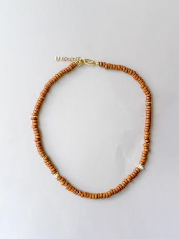 This Terracota necklace is made with honey brown java glass beads, offering a beautiful neutral color. It also features extra links, allowing for a wearable length of up to 22". Perfect for the spring and summer seasons.