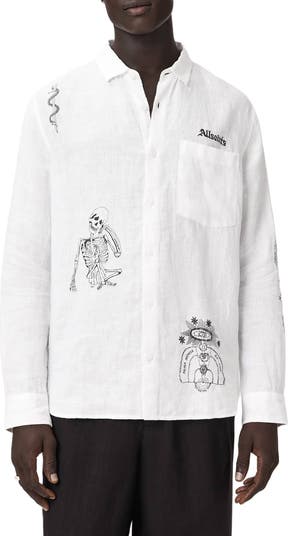 A crisp white button-up gets roughed up in the best way with sketch-like graphics, as if pulled straight from a restless notebook page. Cut from breathable cotton, it keeps the attitude sharp while the feel stays light.