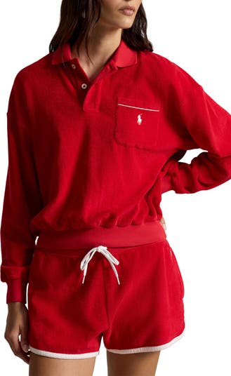 Retro sport meets cozy comfort in this polo-style sweatshirt cut from cotton-blend terry that has the same plushness as your favorite towel. A two-button placket and logo-embroidered chest pocket give it that throwback vibe, while a softly elasticized hem creates an easy, blouson shape.