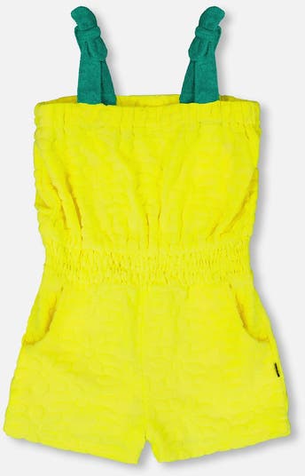 The terry cloth sleeveless jumpsuit in yellow is a cheerful summer essential for girls. This romper features knotted shoulder straps, scoop pockets, an elastic waist, and an elasticized top edge for comfort and style. Finished with an allover yellow floral print and contrasted green staps, it’s a playful piece from our “Like A Fish To Water” collection designed for warm sunny days.