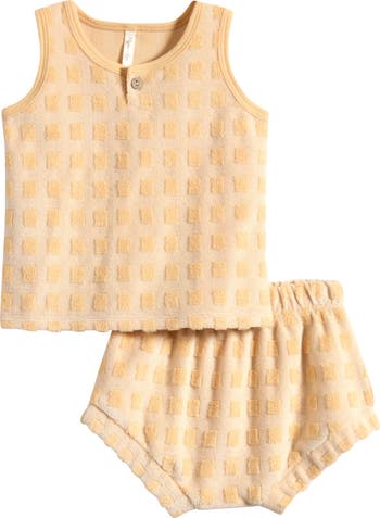 Amp up the warm-weather charm of baby's wardrobe with this comfy terry-cloth set featuring a square-patterned tank and matching shorts.