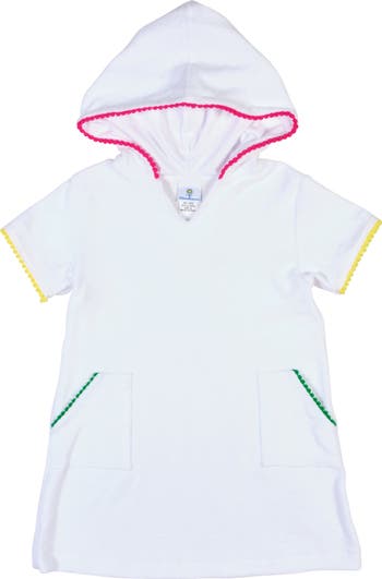 Soft, cozy, made for carefree days in the sun, this white terry cloth coverup is crafted from an absorbent cotton-blend terry—perfect for pool days, beach play, and warm-weather adventures. Multicolor pom-pom trim brings a cheerful pop of fun, while patch pockets and a hood add practicality and comfort.\nEasy to slip on over swimsuits, it’s the ideal layer for drying off, staying cozy, and keeping the sun at bay.
