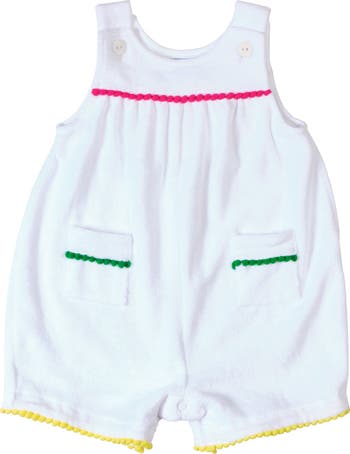 Soft, sunny, and ready for warm-weather play, this romper is crafted from white terry cloth in a cozy cotton-blend that’s perfect for beach and pool days. Cheerful yellow, pink, and green pom poms trim the silhouette with playful color, while two patch pockets add a practical, charming touch.\nButton straps make dressing easy and give the fit a sweet, classic look—ideal for slipping on after a swim or wearing through sun-soaked adventures.