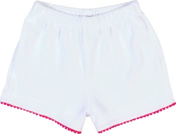 Soft, summery, and full of charm, these white terry cloth shorts are crafted from a cozy cotton-blend perfect for warm-weather play. Pink pom-pom trim adds a cheerful pop of color, while an easy pull-on elastic waistband ensures comfort from beach to backyard. Lightweight and breezy, they’re ideal for pairing with swim tops, tees, or coverups for sunshine-filled adventures. A playful warm-weather staple made for comfort, convenience, and carefree days in the sun.