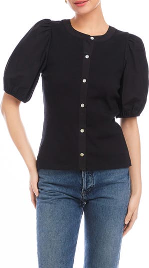 Poplin puff sleeves frame this mixed-media top made with a stretchy ribbed bodice and secured by contrasting buttons down the front.