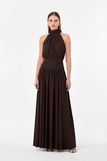 This sleeveless halter neck maxi dress features a soft drape that falls cleanly through the body. A defined waistband creates shape, while a scarf-style back detail adds movement. Finished with button closures at the back neck.