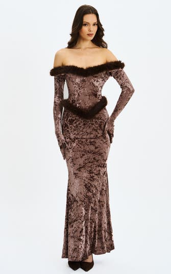 Tessa Sweetheart Bardot Faux Fur Velvet Mermaid Maxi Dress