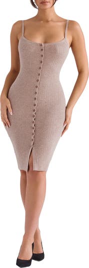 Feel your most cozy in this cashmere-and-wool–kissed sweater-dress featuring dainty buttons down the front.