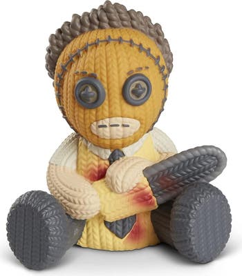 Approximately 5 inches tall and perfect for display or play Our friendly robots designed this figure to look like knit fabric at a glance, but it’s actually made of vinyl Signature vinyl tag on the figure, complete with barcode decal to resemble a sewn-in tag Leatherface never looked so unique!