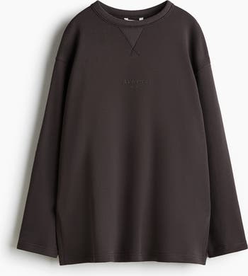 Oversized top in lightweight cotton sweatshirt fabric with a tone-on-tone, embroidered text motif on the chest. Ribbed crew neck, dropped shoulders, long sleeves and a straight-cut hem with a slit at each side.