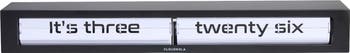 Crisp minimalism refines a sleek clock housed in a bamboo wood case with a text-based readout completing the playful blend of futuristic and retro.