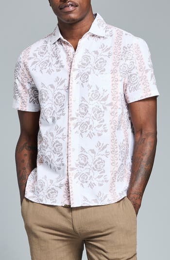 Soft, airy texture enhances the breathability of this vacation-perfect top updated with short sleeves and a tropical print.