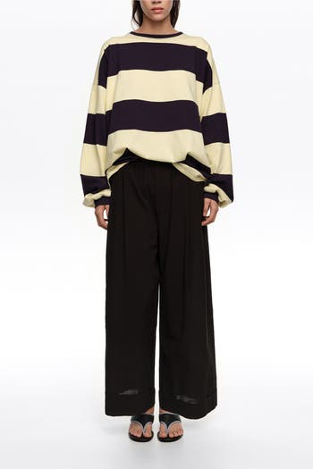 Ankle-length bell-bottom trousers in a cotton blend. Feature a front button fastening, a mid-rise waist, slanted pockets, an elasticated waistband, and turn-up hems