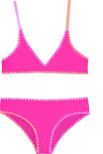 This vibrant fuchsia Rani bikini swimsuit combines style with functionality. The triangle top showcases eye-catching multicolor embroidered edges, while adjustable straps ensure a personalized fit.
