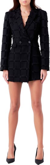 Swingy fringe adds texture and movement to this modern yet polished blazer romper covered in a wide tonal grid.