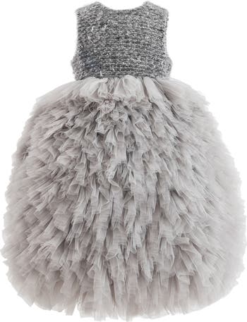 A showstopping piece for formal occasions, this sleeveless dress pairs a richly textured bodice with a voluminous cascade of layered gray tulle. The dramatic silhouette and elegant tones make it a standout for celebrations. Multi-layered ruffled tulle skirt creates a full, princess-like shape. Soft inner lining ensures comfort for all-day wear.