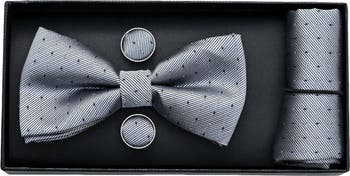 This set includes a bow tie (with adjustable neck strap), cufflinks, and a matching pocket square. Crafted with timeless style in mind, these accessories are perfect to complete any special occasion outfit.