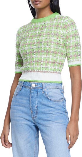 A textured check design lends mesmerizing dimension to a short-sleeve sweater kissed with wool and a touch of sparkle.