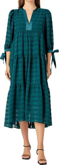 Satin ribbon trim and a shimmery grid pattern bring plenty of texture and sophistication to this light and airy chiffon dress.